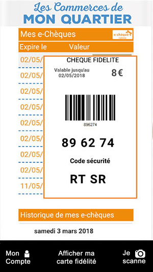 ![]() Présentez au commerçant votre code client ![]() Faites maintenant confiance à votre commerçant, vous allez instantanément recevoir vos pointsUn minimum de 10€ d'achat est obligatoire pour pouvoir collecter des points fidélité. Je reçois mes Chèques fidélitéVos Chèques fidélité apparaissent dans la rubrique "Chèques fidélité". Valeur de vos Chèques fidélité : minimum 2€ et en fonction du taux de fidélité appliqué par chaque commerçant. Validité de vos Chèques fidélité : indiqué sur chaque chèque fidélité et différent selon le magasin. J'utilise mes Chèques fidélitéOuvrez l'application et cliquez sur "Chèques fidélité". Sélectionnez un chèque fidélité pour l'afficher sur votre smartphone, chaque chèque fidélité comporte le nom du magasin dans lequel il peut être utilisé, le montant de la remise et la date de validité. Présentez votre Smartphone au commerçant